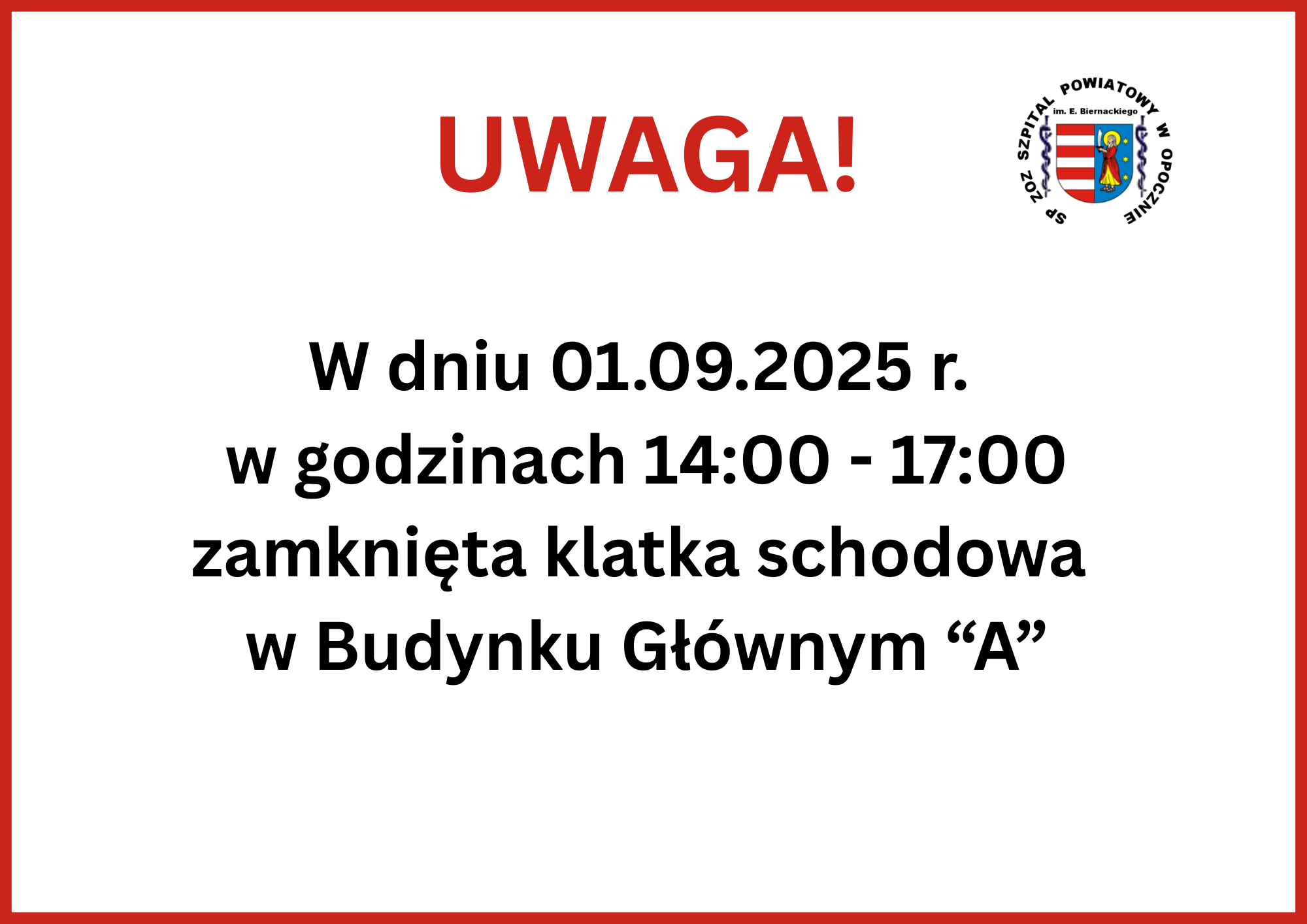 w godzinach 14:00–17:00 zostaje czasowo zamknięta klatka schodowa w budynku głównym „A” naszego Szpitala.