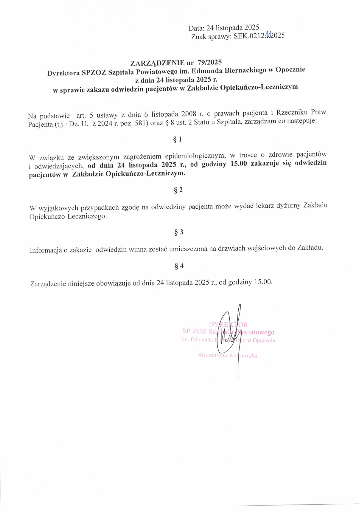 w związku ze zwiększonym zagrożeniem epidemiologicznym w Zakładzie Opiekuńczo-Leczniczym naszego Szpitala, z dniem 24 listopada 2025 r. od godziny 15:00 na podstawie Zarządzenia nr 79/2025 Dyrektora SP ZOZ Szpitala Powiatowego im. Edmunda Biernackiego w Opocznie z dnia 24 listopada 2025 r. wprowadza się zakaz odwiedzin pacjentów.